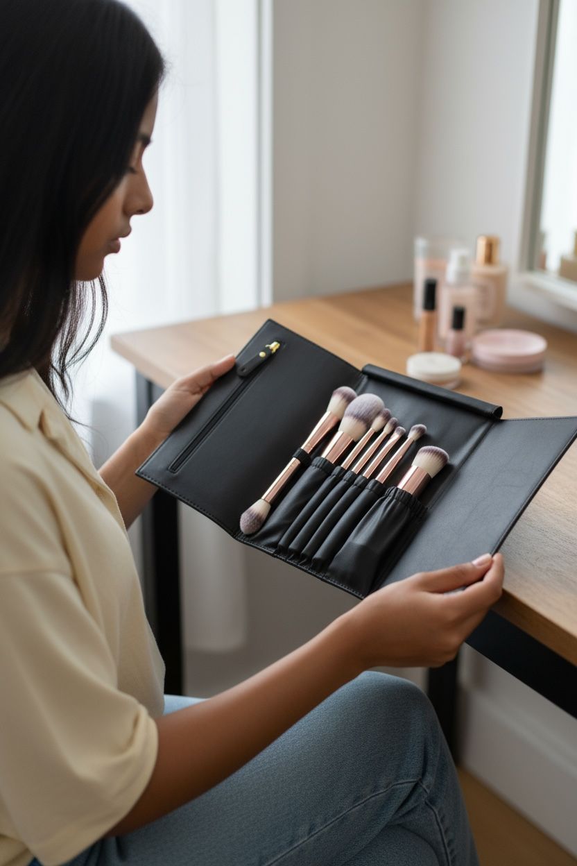 Yes! The set comes in a sleek, durable pouch that’s perfect for travel. It keeps your brushes organized and protected, so you can take them wherever you go.